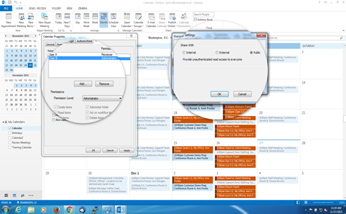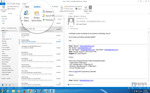 ZCO provides your Outlook users with Zimbra’s advanced Calendar and Contacts features. They can share calendars internally with project team members and externally with partners, customers, etc. Calendars can even be shared publicly via a link. Contacts can be shared via a standard format.